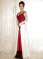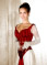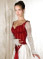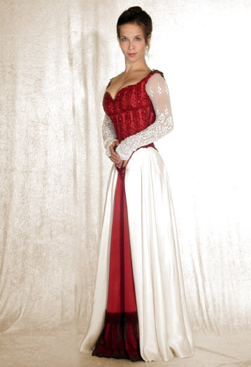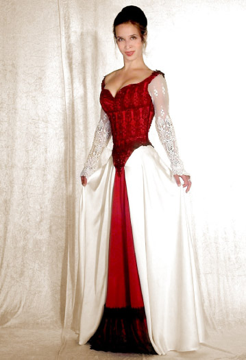 The Snow White Gown has a striking dramatic flare. Its brilliant red satin silk bodice has an intricately embroidered matching lace overlay.