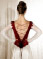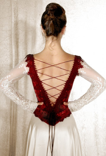 The ruby red lace appliqués and beautiful glass crystals form the heart shaped neckline and flattering dropped V waistline of the bodice. Its elegant tight sleeves are of an off white color and are made from the same regal lace as on the bodice. They end in a V and are attached to the middle finger with a small loop.