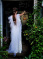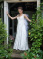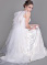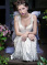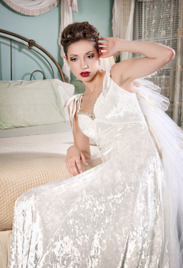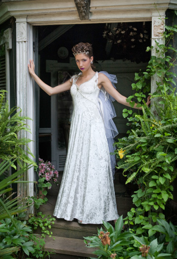 This playful gown is made of white crushed velvet with a collar of rhinestone trim. The wings, made of gathered tulle, attach at the shoulders of the gown and follow the deep open back, trailing behind.