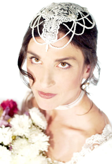 Margerite is a simple lace cap which is adorned with five jewel pieces and exquisite draping strands of pearls.