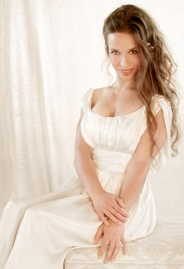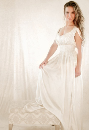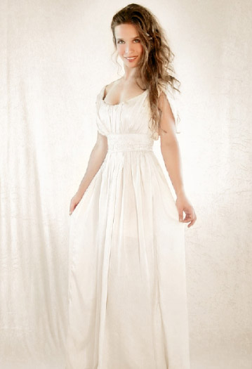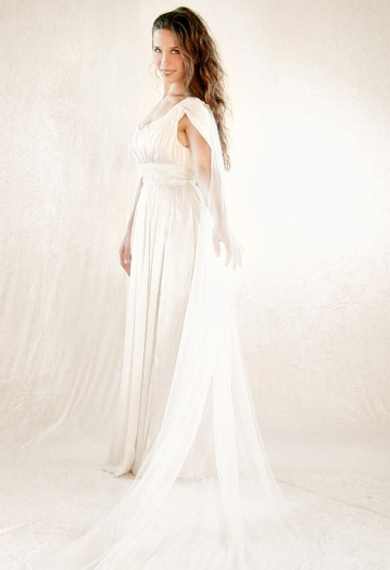 The Goddess Gown, a simple, radiant, flowing dress, is made from 100% fine satin silk, adorned with a hand beaded and embroidered silk sash. It is of an ancient Greek style and comes with a detachable train. To preserve the natural fall of the material, this dress is mainly stitched by hand. It is a suitable dress for outdoor summer weddings.