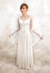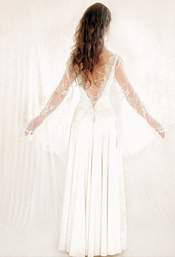 Lady Elaine is a classical medieval gown with a simple, elegant look. It is delicately decorated by braids which end in a Celtic knot at the waist. These and the other lines of the dress emphasize the graceful flow of the feminine body. Its beautiful ethereal sleeves are made out of finely embroidered and hand beaded lace.