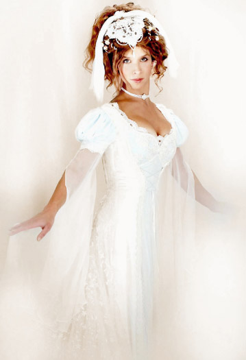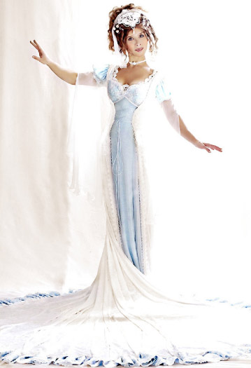 The Faerie is a wonderful wedding gown for a bride that wishes to have a gentle touch of color incorporated in to her gown. It is also possible to have it made entirely in off white. With its soft touch of lace and gentle color your gown will have a refreshing magical look.