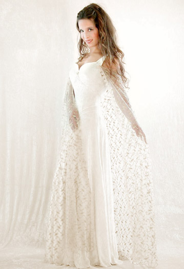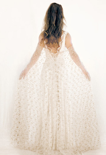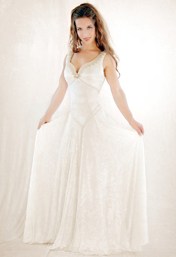 The Queene Guinevere is a feminine, flowing design, which is beautifully simplistic. You will be sure to feel like a graceful nymph as you walk or dance in this lovely design.